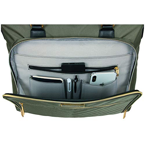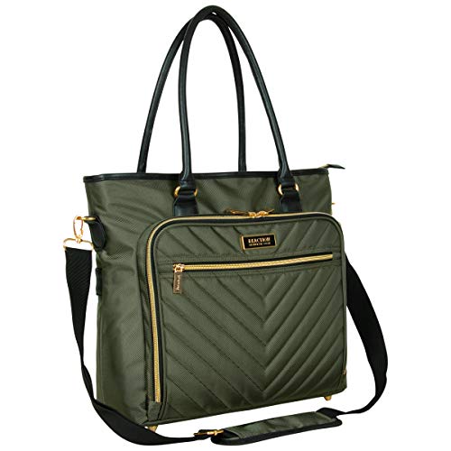 Details: A must-have tote, fashionable enough for everyday use. The stylish, polyester twill exterior with chevron quilted detail and a tear-resistant, fully-lined interior and sturdy construction with a large single compartment and eye-catching, distinctive gold hardware make this bag great for business and travel alike. The laptop pocket is padded to fit most laptops with up to a 15-inch screen, and a separate padded tablet pocket fits most tablets. The front exterior has an easy-access zipper pocket for frequently needed items. A zip around front organization compartment with an open Slip Pocket and zippered pockets holds all of your business essentials. The main compartment includes a padded tablet pocket, laptop pocket, and zipper pocket, while still leaving plenty of room to store other needed belongings. The rear exterior features a trolley strap to fit over most luggage trolley handles for hands-free carrying, and tote style handles made to be worn over the shoulder allow an 8.5-Inch handle drop. Another carrying option is the removable, adjustable, padded shoulder strap that extends to be 52 inches long. Perfect tote for work, school, college, as a gift, for valentine’s day or Mother’s Day, or to hold all your needed belongings on your commute to work. A straightforward and stylish tote, great for business, travel, or everyday use. ★ Overall Dimensions: 17” L x 13” H x 5” D. ★ Laptop pocket Dimensions: 15” L x 10.5” H x 1.0” D. ★ Weight: 2.15 lbs. ★
