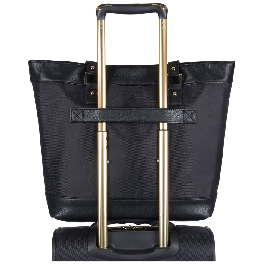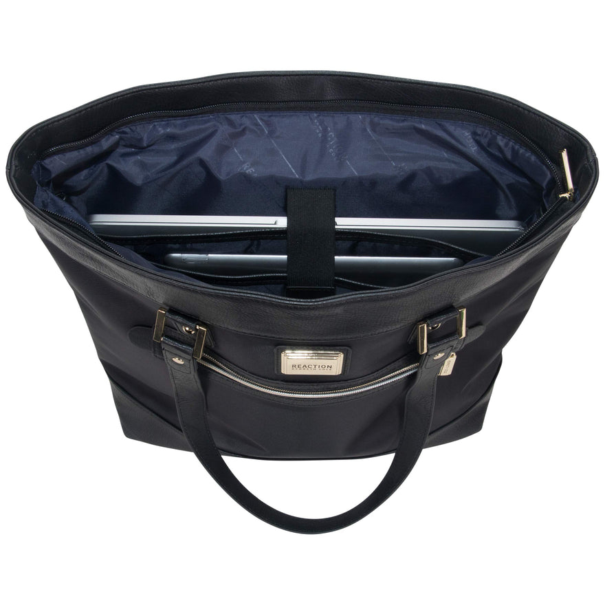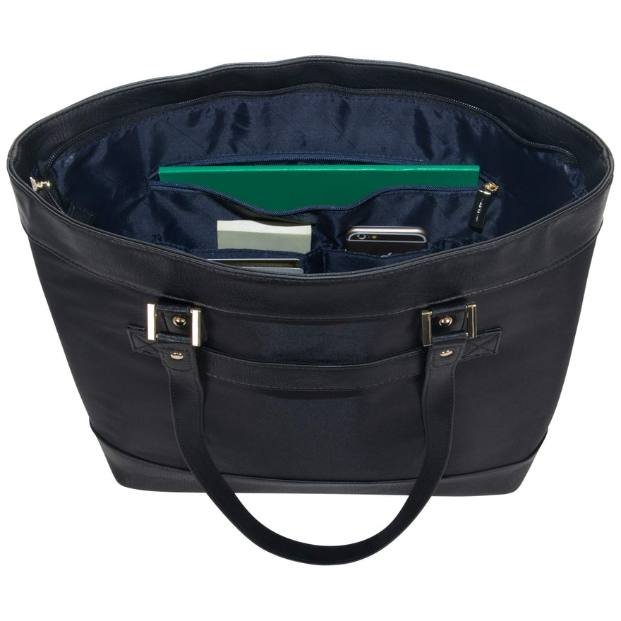 Details: Nylon twill single gusset top zip 16 inch computer tote. Holds most laptops with up to 16 inch screen. Padded tablet pocket holds most tablets. Nylon twill with soft vinyl trim Exterior body material with fully lined interior. Single gusset bucket style construction with top zip closure. Easy access front Exterior zipper pocket. Main compartment features a padded computer pocket, a padded tablet pocket and an organizer. Rear exterior features a trolley strap that fits over most upright handles for hands free carrying. Convenient padded top handles with handle wrap. Manufacturer lifetime limited warranty. Size: 18.0 inch w x 13.0 inch h x 5.0 inch D. Computer compartment Dimensions: 15.0 inch w x 11.75 inch h x 1.75 inch D. Weight: 2.1 lbs
