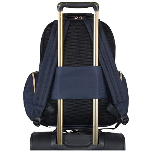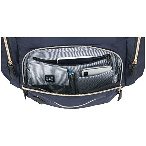 Details: Radio frequency identification (RFID) Blocking technology in organizer pockets Lined with thin shielding fabric to help block Radio Waves From Being Transmitted From yours. Passports and Certain Credit/Debit Cards padded computer pocket fits most 15" Laptops padded tablet pocket accommodates most tablets stylish, sleek nylon exterior with gold zips and a tear-resistant, fully lined interior Front exterior features a hidden zippered stash pocket to store and protect valuables and an RFID protected zip down organizer pocket to store a variety of business essentials dual side exterior zip around pockets to hold water bottles or accessories front compartment includes a padded tablet pocket, two open Slip Pockets, with room to hold other needed belongings Rear compartment is fully padded to hold and protect your laptop easy to grab top handle Rear exterior features a mesh back panel, trolley tunnel to fit over most luggage upright trolley handles for hands free carrying, and adjustable, padded shoulder straps overall Dimensions: 16" H x 13" L x 6" D Weight: 1.8 lbs. includes a lifetime limited manufactures warranty