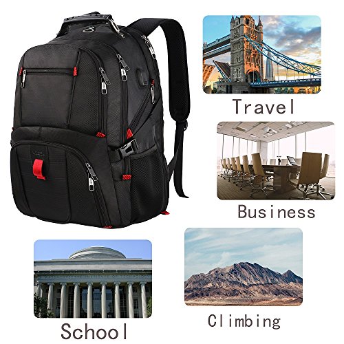 - DIMENSION & LARGE CAPACITY: Size:14.96*10.4*19.49 inches, Large capacity 45L with 20+ organizer pockets could meet your various needs. The large multi-compartment backpack with a padded sleeve for 13,13.3,14,15,15.6,17 Inch Laptops/Macbooks/computers for boys and girls,stendents,teens,women and men. Organizational compartments can be used as additional supplies and accessories for iPhone, iPad, pens, keys, wallets, books, clothes, passports and cell phone. Mesh water bottle pockets at sides