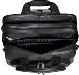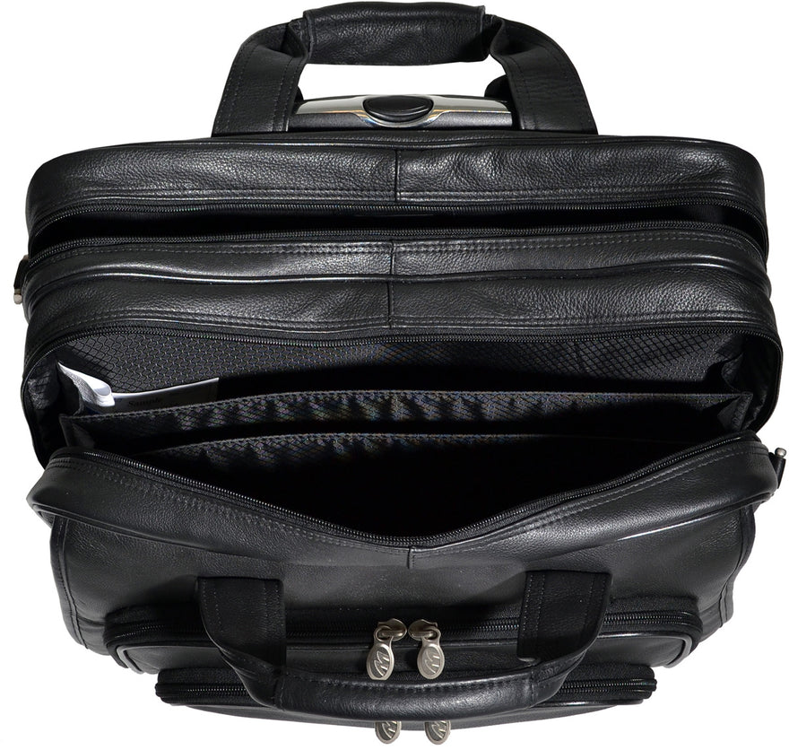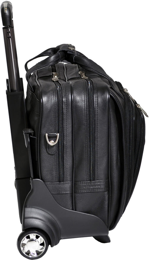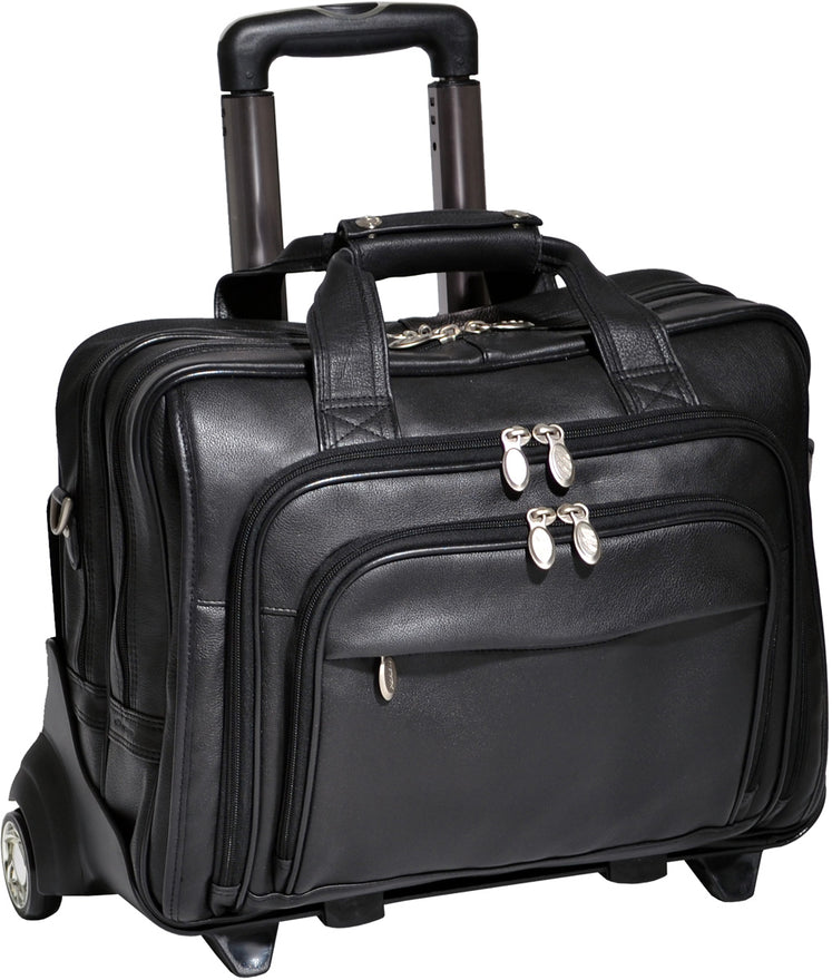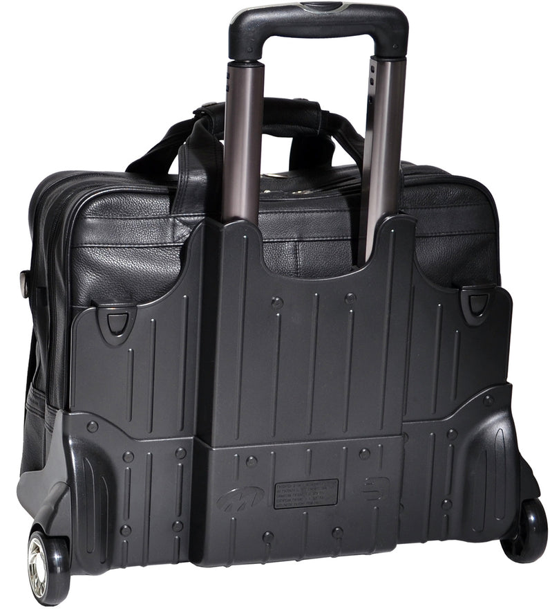 Patented 2-in-1 Detachable Wheel and Handle System. Front zipper pocket provides for small miscellaneous items. Two front organizers pockets for media devices, cells phone, business cards, key chain holder and pens. Front compartment features file divider for documents. Back compartment padded to protect laptops up to most 17 in size. Dual Laptop Protection System uses a high-tech ABS honeycomb frame to protect laptop from exterior impact and 10 mm high-density foam to help absorb shock and moisture. Smart Attachment Strap Attachment allows transport on extended handles of other rolling cases and luggage. Bonus! Protective Weatherproof Cover. Advanced, non-slip, shock absorbing neoprene Comfort Flex Shoulder Strap stretches for comfort, alleviating body strain.