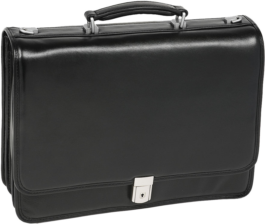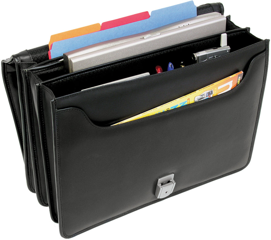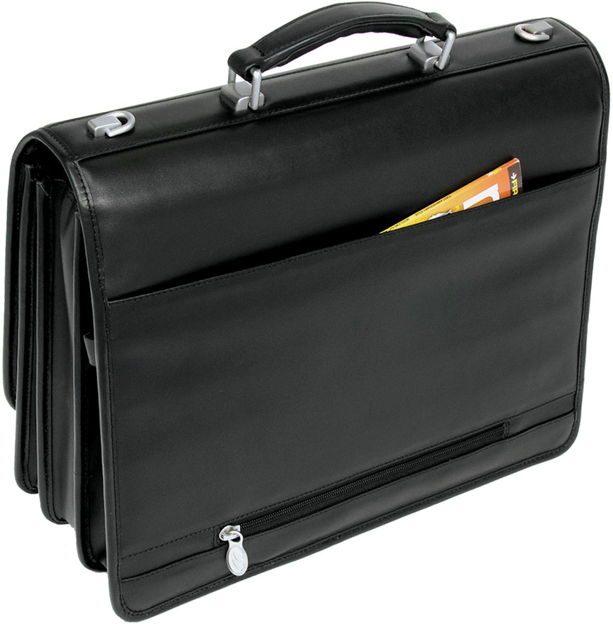 Clean line design features secure key lock on front flap. Front compartment with space for files; complete with organizer for media devices, cell phone, business cards and pens. Triple compartment divided by secured zipper section for important documents. Middle compartment padded with high-density foam to provide laptop protection, including most 17" laptops. Back compartment provides space for important documents. Smart Zipper Attachment allows transport on extended handles of other rolling cases amp; luggage. Advanced, non-slip, shock absorbing neoprene Comfort Flex Shoulder Strap stretches for comfort, alleviating body strain.