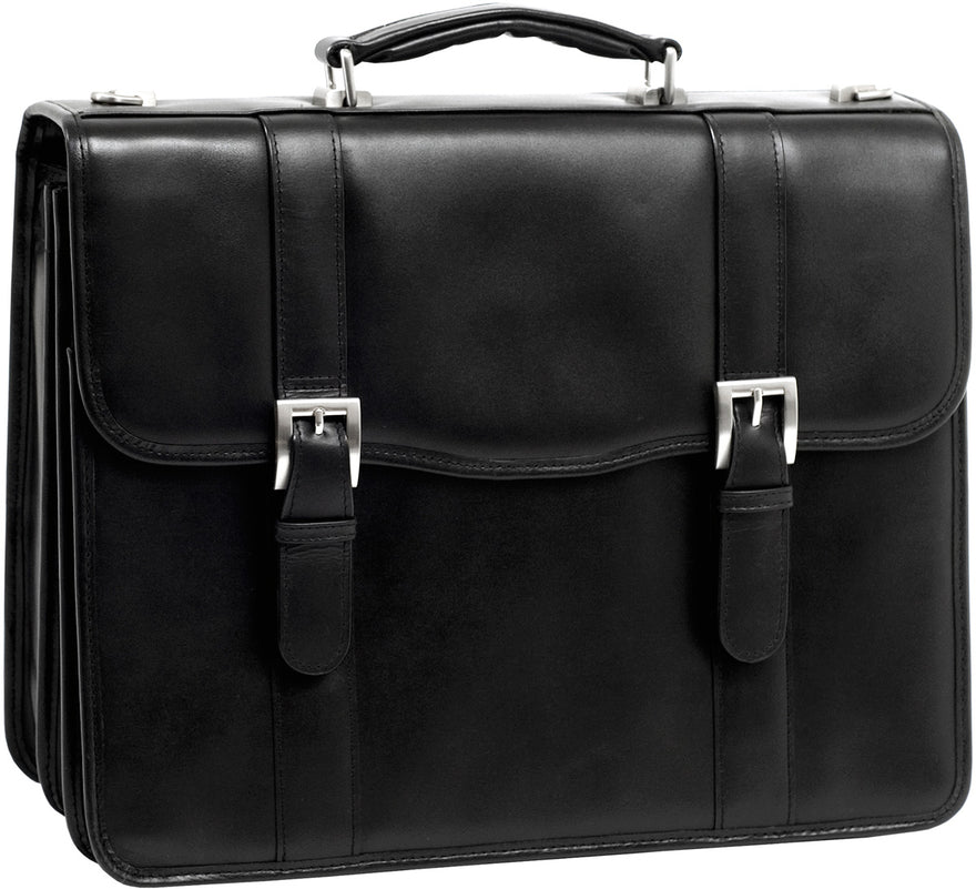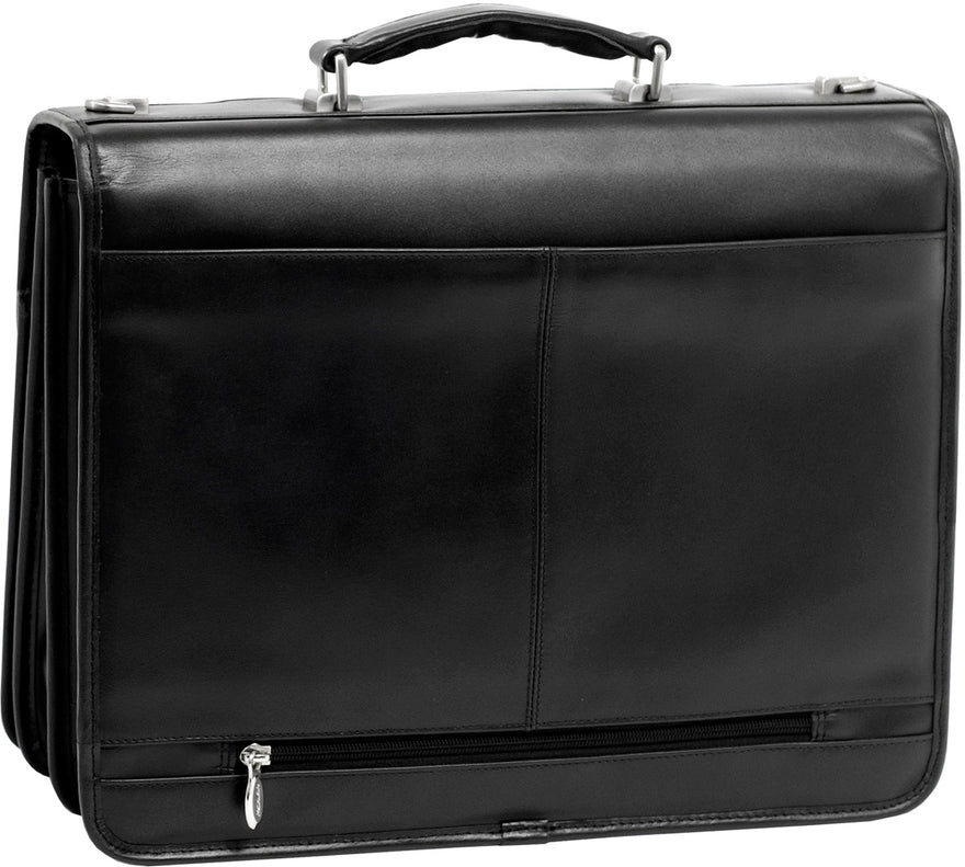 Flap-over design with dual secure slip lock clasps. Dual front pockets hold small accessories. Front compartment provides space for files. Back compartment features an interior organizer for pens, business cards and small devices. Back compartment also features a padded laptop compartment that fits and protects most laptops up to 15.4" in screen size. Adjustable, non-slip, shock absorbing shoulder strap alleviates body strain. Smart Zipper Attachment allows transport on extended handles of other rolling cases amp; luggage.