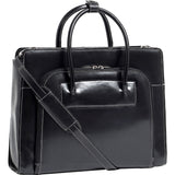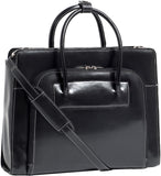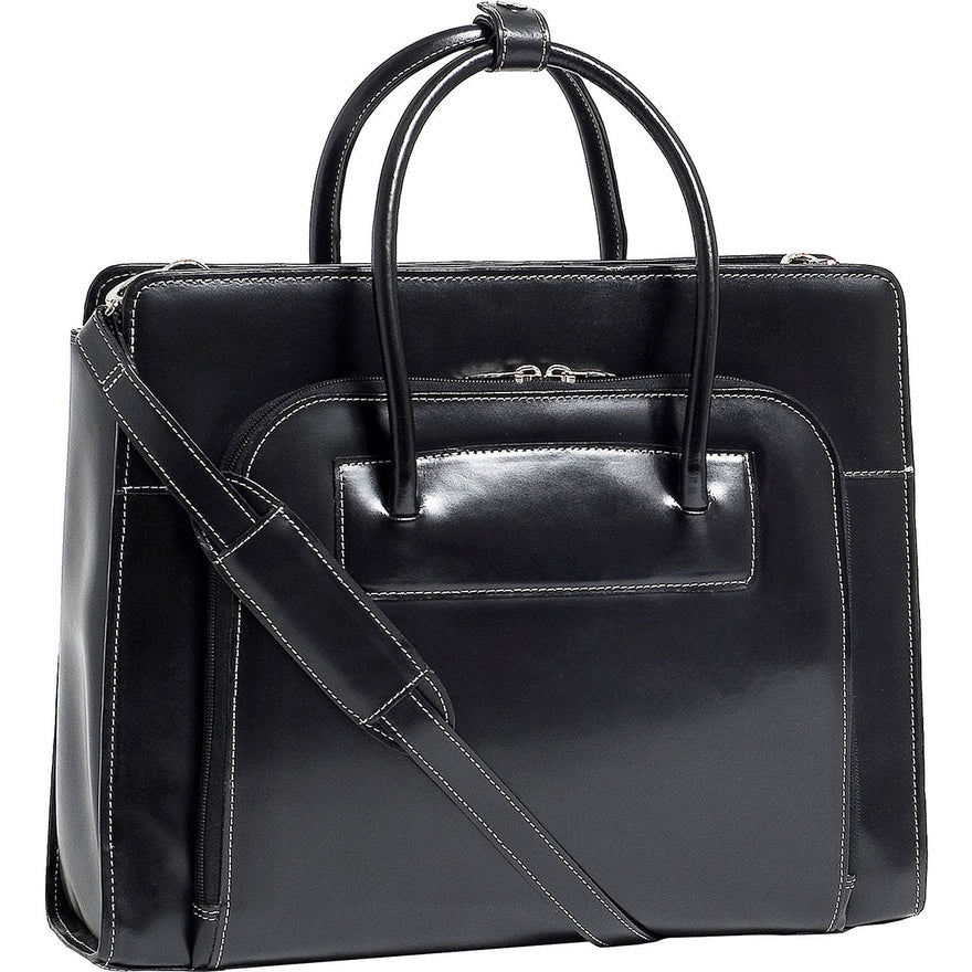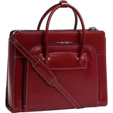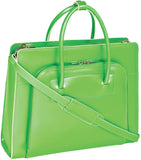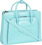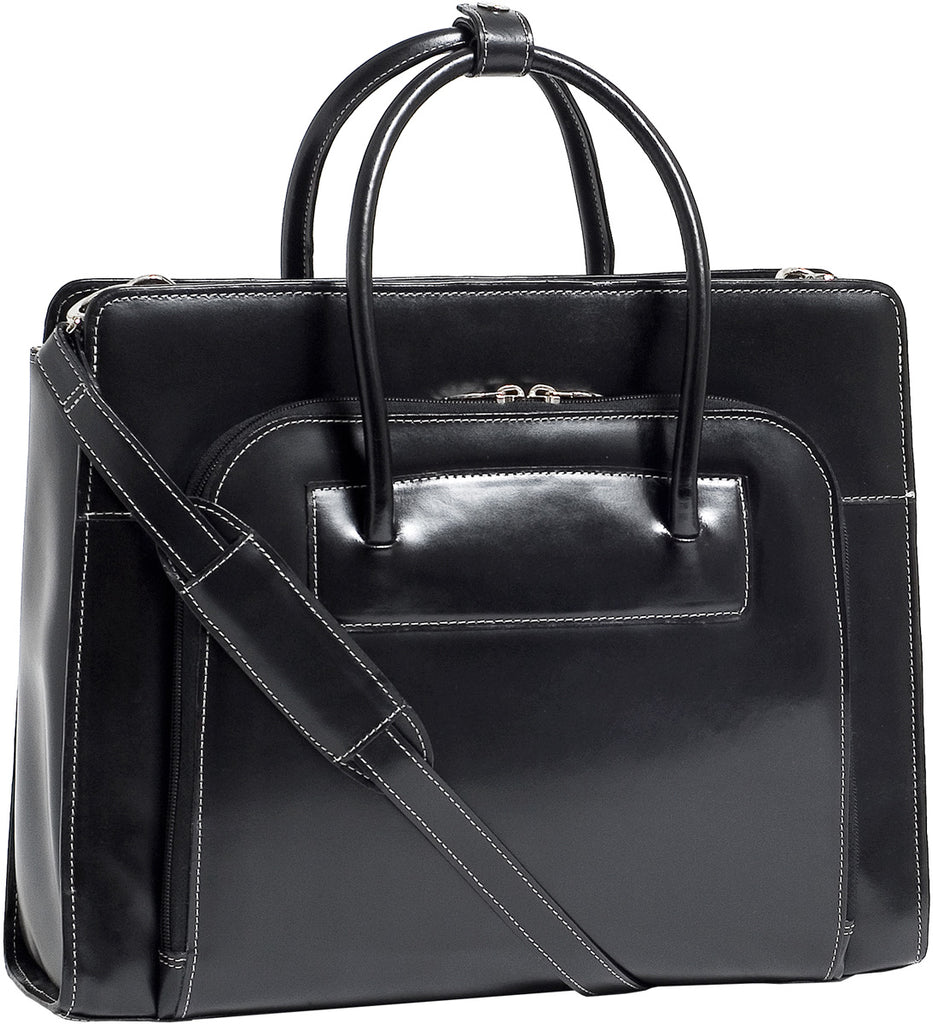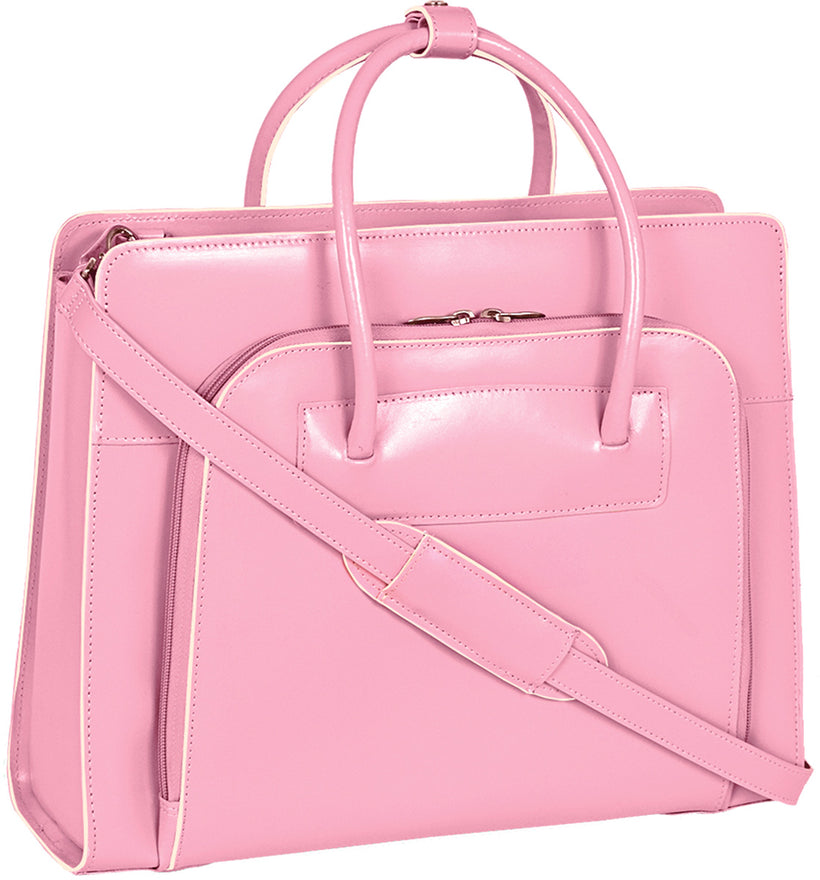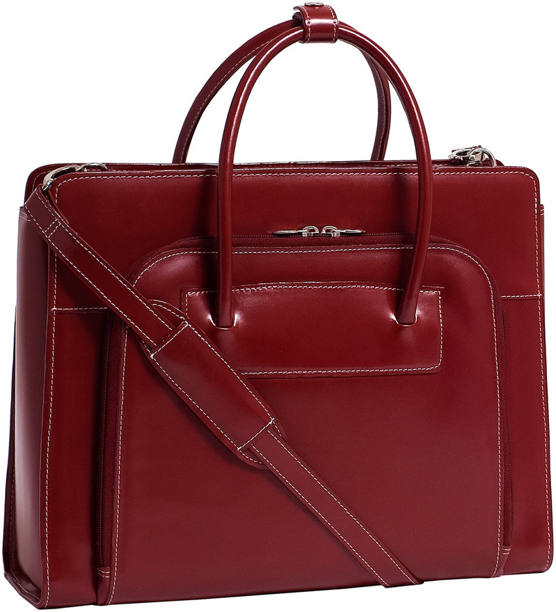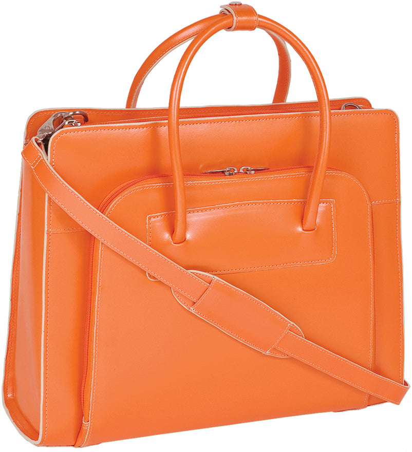 Sleek, contoured design features a top zipper allowing easy access to the main compartment. Front organizer zipper section with storage space for media devices, business cards, key holder and pens. Interior zipper pocket to help organize. Double compartment divided by secured zipper pocket for important documents. Practical amp; stylish tubular leather arm straps. Matching leather shoulder strap with non-slip neoprene absorbs shock and alleviates body strain. Removable high-density laptop sleeve that protects laptops up to 13 in size. Black case is trimmed in black. Red case is trimmed in red. Orange, green, blue, sand and pink cases are trimmed in sand.