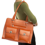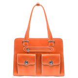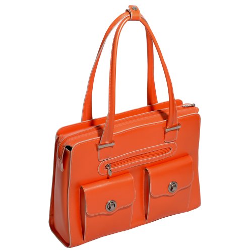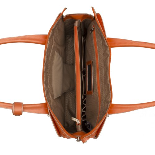 Details: Two small front pockets with magnetic snaps. Front and back pocket for files. Main compartment divided by secure zipper pocket. Built-in padded laptop sleeve that fits laptops up to 15. 4". Includes tablet pocket. Interior organizer section for business cards, pens, keys, cell phones and notepads. Tubular over the shoulder straps Orange, Green, Blue, and Pink cases are trimmed in sand.