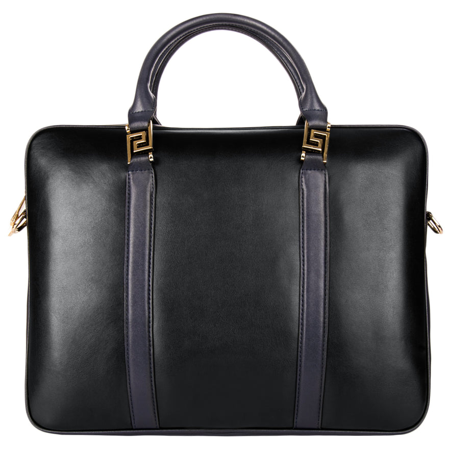 - Exterior features two tone coloring using Black and Charcoal Blue colored Leather, polished metal hardware for added style