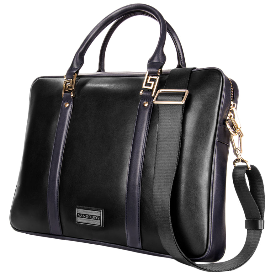 Details: The VanGoddy Meka is a sophisticated laptop carrier designed for those of the executive class. Using 100% genuine Leather and polished metal hardware, this bag stands out from the rest all while keeping you productive and fashionable. The exterior is veiled in a full Leather enclosure with Charcoal Blue Leather accents for added subtle style. The interior features a Mocha Brown interior with 2 slip pockets for added organization, 1 large zippered pocket, generous storage space, and a dedicated padded laptop compartment with strapping. This bag can be carried comfortably in hand or worn on the shoulder using the included shoulder strap.