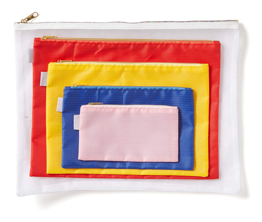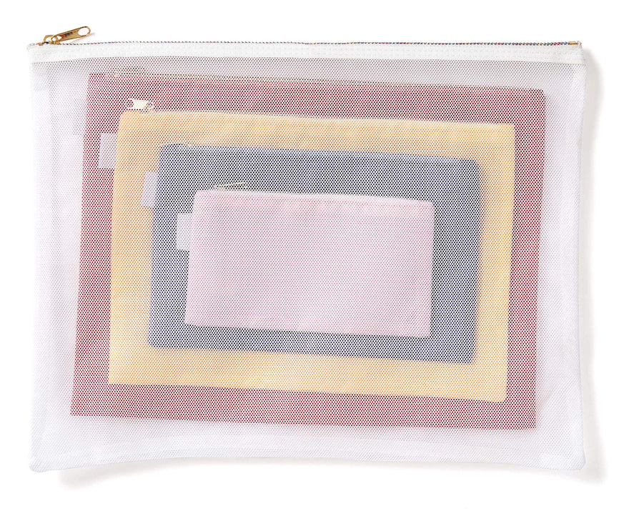 - Pink bag: 3.5 inches x 6.75 inches; Blue bag: 5.5 inches x 8.75 inches; Yellow bag: 7.5 inches x 10.75 inches; Red bag: 9.5 inches x 12.75 inches; White bag (mesh): 11.5 inches x 14.75 inches