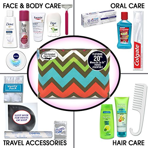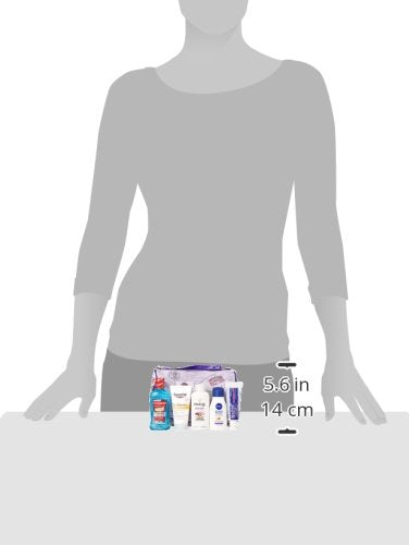 Details: 19 Piece Kit Contains: Pantene Shampoo 1.7 oz., Pantene Conditioner 1.7 oz., TRESemme nonAerosol Hair Spray 2 oz., Dove Body Wash 3 oz., Shower Poof, Shower Comb, Secret A/P Deodorant 0.5 oz., Eucerin Lotion 1 oz., Eucerin Daily Protection Moisturizing Face Lotion SPF 30 1 oz., Crest Toothpaste 0.85 oz., Colgate Toothbrush, Colgate Total Mouthwash 2 oz., Gillette Good News Disposable Razor, Nail File, Tampax Tampon, Vanity Pack (35 swabs / 6 cotton balls), Facial Wipes 8 count, Eye Mask, TSA Compliant Quart Size Zip- Top Bag in Purple Floral Cosmetic Bag with Handle.