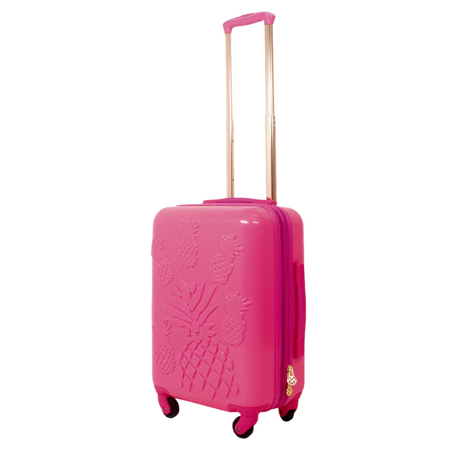 Details: The festive pineapple motif of the Macbeth pineapple hard sided rolling luggage suitcase makes it a must have for any jet-setter on the go. It is made with durable ABS plastic that stands up to travel wear and tear. The lightweight luggage rolls around on 360 degree spinner wheels with a stylish multi telescopic pull that has a metallic gold finish. The full body main compartment lets you bring everything you need on your journey, and you can secure your clothing with built-in compression straps. An interior zipper mesh compartment is perfect for keeping your travel bottles secure, and you can pack more with a 2 inch expandable zipper gusset. It is easy to load into overhead bins and cars with retractable top and side panel handles.