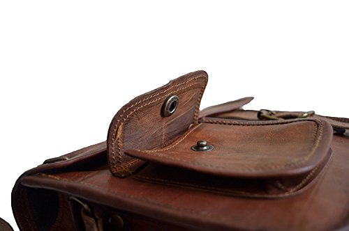 Details: Material: High quality Genuine Leather Light weight Can hold 13" Inch ipad / tab/netbook etc. 3 compartments, bag spacious enough for more than just ipad/laptop. Heavy duty metal buckles. Has a front pocket with snap button closure for easy access. Sturdy green lining for long life. Adjustable sling Will be shipped in a non - retail packing. Shipping through Expedite mode available. 100% pure leather hence should be cleaned by a leather cleaner only. handle on top for easy carry. Dimensions SIZE: 10 inch. X 13 inch. X 3 inch. (height,width, depth) Sling : 56 Inches , Shoulder drop = 24 Inches (approx) Color: Brown The bag is made up of naturally tanned leather and hence may have some odor when new. The odor may be overwhelming for some. Airing out the bag for a day in direct sunlight shall eliminate the odor. The odor is not a defect. Please note that the leather is full grain and hence shall preserve the scars and other signs as the animal had and hence shall not be considered defect. These scars etc grow old wit time and adds character to the product