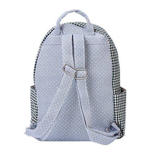 Details: The backpacks are made of canvas fabric with dots and lattice pattern print.Main compartment and 2 twin pockets on the both side-zips to fasten.1 large pocket with magic snap closure to the front.Adjustable shoulder straps.this a good choice for daytime or travl outdoor activities.Measurement is app 34x11x36cm(13.3"x4.33"x14.17")