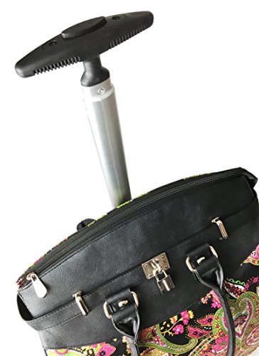 Details: 1 main zipper compartment which opens wide. Inside: 1 zipper pocket & attached padded laptop area with securing velcro strap. Padded laptop area can fit laptop 12" wide, 12" tall and 2" thick using securing velcro strap. Padded laptop area can fit laptop 12" wide, 17" tall and 2" thick without using securing velcro strap. Horizontal Straps/belts across top to reinforce bag when closed. 4 sturdy spinner wheels at the bottom. Bottom folds for easy storage. Adjustable handle is extended with a push button. Extendable handle is designed to be loose so it can absorb more shock & last longer. Thick strap in back is used to cover mechanics of handle but can also be used to secure bag on top of any luggage with handle. Nonfunctional accent lock in front.