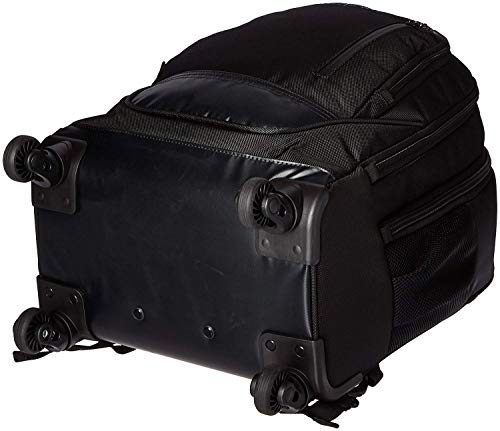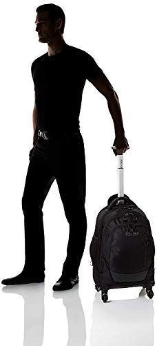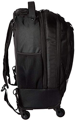 Details: 1680D polyester & coated polyester Double gusset 4-wheel 17. 0 inch computer backpack. 4-Wheel spinners for easy mobility and 360 Degree movement. Holds most laptops with up to a 17. 0 inch screen. Compatible with most tablets. 1680D polyester and coated polyester exterior body material with fully lined interior. Front exterior pocket Features organizer pockets for phone, glasses, and all school/ business needs. Front compartment used for laptop and tablet protection with room for files or other documents. Rear compartment includes a file pocket and garment straps to secure clothing. Side exterior features dual beverage/ accessory holsters. Eva padded, easy to grab top handle. Telescoping, retractable single tunnel tube. Breathable air-mesh padded shoulder straps. Hide away shoulder straps for convenience. Size: 22. 0 inch h x 14. 0 inch w x 9. 0 inch D. Computer compartment Dimensions: 16. 0 inch h x 10. 5 inch w x 1. 5 inch D. Volume: 2100 cu. In/ weight: 5. 95 lbs.