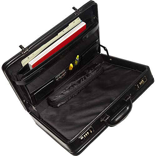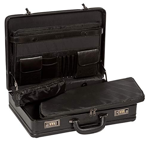 Details: Attache Computer Case With Stylish Matte Finish Leather Exterior Large Capacity 4 inch Body Expands To 4.75 inch For Added Carrying Capacity When Needed Expandable 3-File Organizer Includes Flap Pockets, Pen/Pencil Holders, Card Slots, And A Full Length Open Top Pocket. Roomy Main Compartment Features Restraint Straps Made To Fit A Laptop With Up To A 17 inch Screen Includes A Removable Accessory Pouch And A Removable Computer Sleeve Made To Fit Most Laptops With Up To A 17.0 inch Screen. Dual Combination Locks For Added Security. Sturdy Top Handle For Easy Lifting
