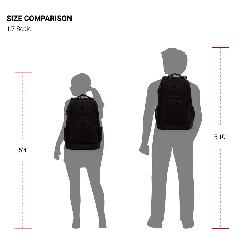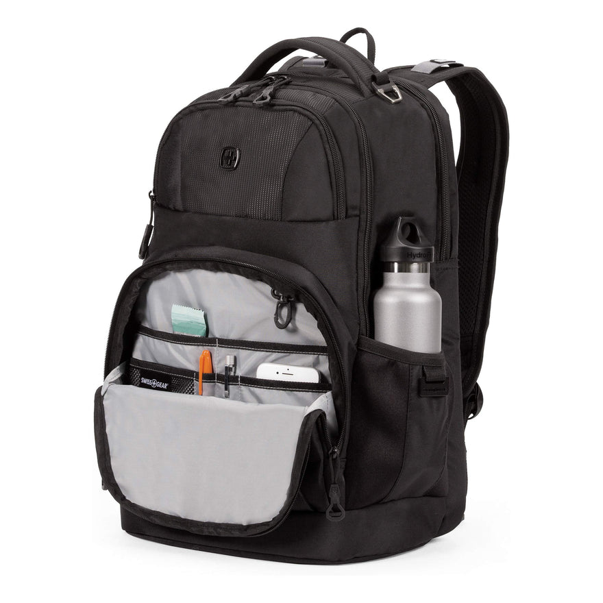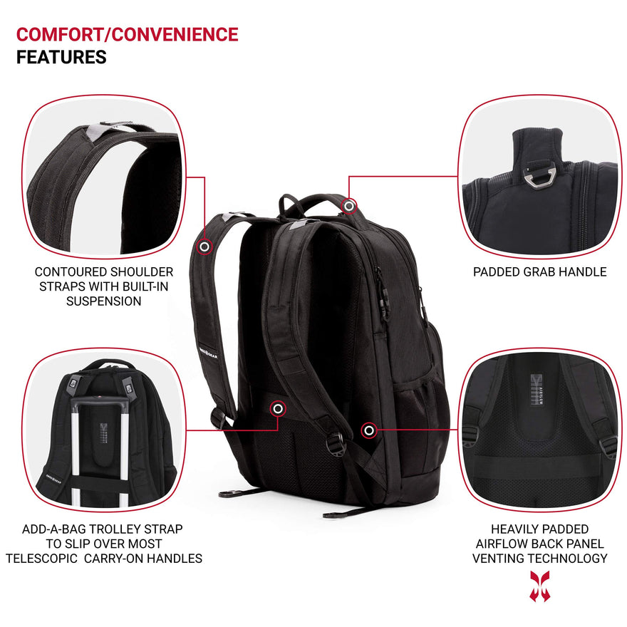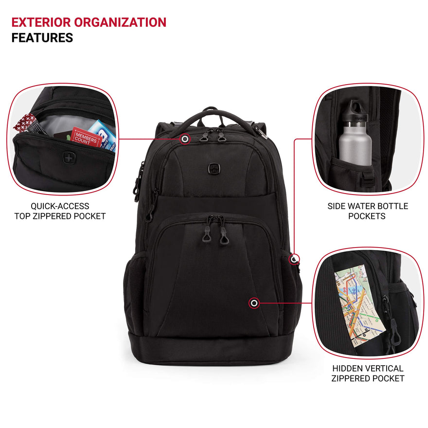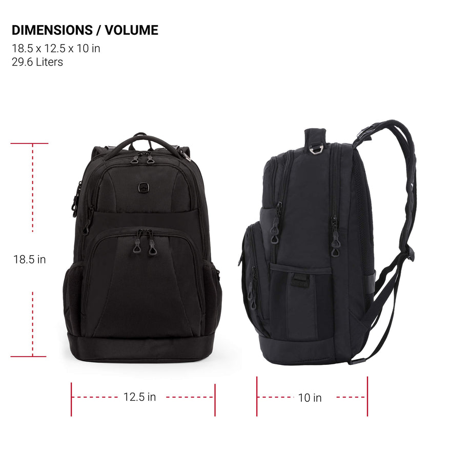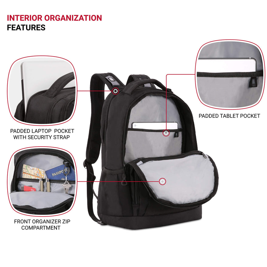 Details: A classic design complements its urban functionality and modernity. The Swissgear 5698 Laptop Backpack is a classic abode that should be introduced into your everyday collection. A zip laptop compartment entails a plush 15" sleeve to protect your tech, while its main zip compartment unveils a padded tablet sleeve and a mesh adaptor pocket. Organize supplies, smartphone, ID and other necessities within its front zip organizer pocket and store specific items inside additional front zip pockets. Stay hydrated on-the-go and nestle your water canteen inside its mesh side pockets. Ergonomic shoulder straps, an Airflow back panel, and add-a-bag trolley sleeve can easily transition you from campus trendsetter to contemporary jet-setter.