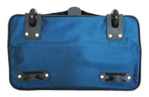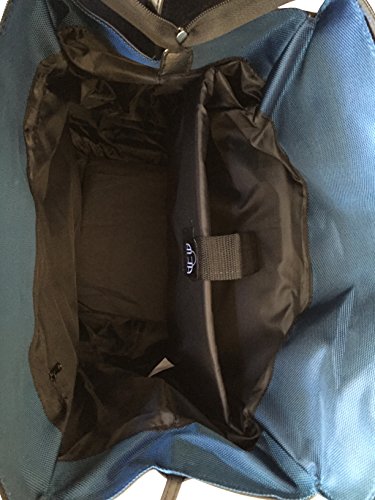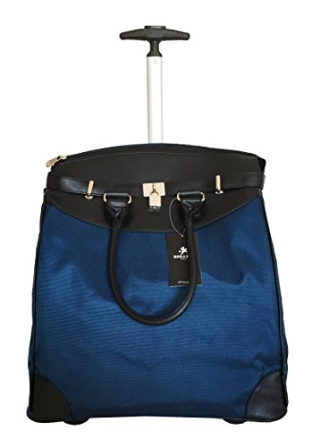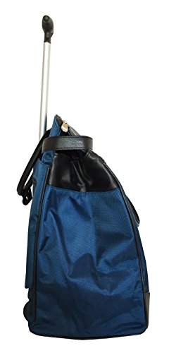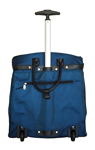 Details: 1 main zipper compartment which opens wide. Inside: 1 zipper pocket & attached padded laptop area with securing velcro strap. Horizontal Straps/belts across top to reinforce bag when closed. 2 sturdy wheels at the bottom. Bottom folds for easy storage. Adjustable handle is extended with a push button. Extendable handle is designed to be loose so it can absorb more shock & last longer. Thick strap in back is used to cover mechanics of handle but can also be used to secure bag on top of any luggage with handle.Nonfunctional accent lock in front.