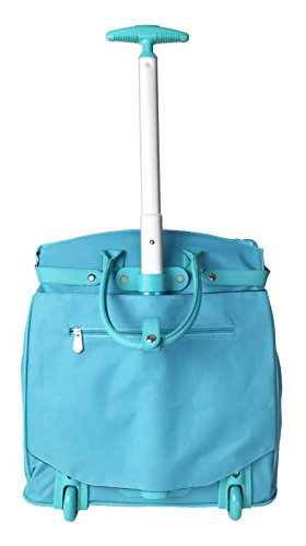Details: 1 main zipper compartment which opens wide. Inside: 1 zipper pocket & attached padded laptop area with securing velcro strap. Padded laptop area can fit laptop 12.5" wide, 11" tall and 1.5" thick using securing velcro strap. Padded laptop area can fit laptop 12.5" wide, 17" tall and 1.5" thick without using securing velcro strap. Horizontal Straps/belts across top to reinforce bag when closed. 2 sturdy wheels at the bottom. Bottom folds for easy storage. Adjustable handle is extended with a push button. Extendable handle is designed to be loose so it can absorb more shock & last longer. Thick strap in back is used to cover mechanics of handle but can also be used to secure bag on top of any luggage with handle. Nonfunctional accent lock in front.