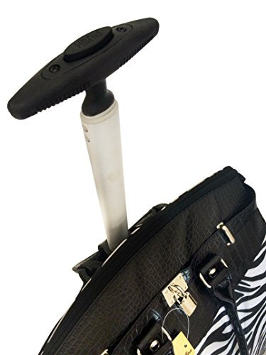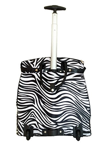 Details: 1 main zipper compartment which opens wide Inside: 1 zipper pocket & attached padded laptop area with securing velcro strap Padded laptop area can fit laptop 12" wide, 12" tall and 2" thick using securing velcro strap Padded laptop area can fit laptop 12" wide, 17" tall and 2" thick without using securing velcro strap Horizontal Straps/belts across top to reinforce bag when closed 2 sturdy wheels at the bottom Bottom folds for easy storage Adjustable handle is extended with a push button Extendable handle is designed to be loose so it can absorb more shock & last longer Thick strap in back is used to cover mechanics of handle but can also be used to secure bag on top of any luggage with handle Nonfunctional accent lock in front