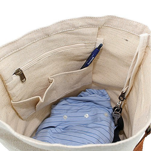 Details: Material: Jute Canvas, Dimension: 15" high x 17" wide x 5" d, Color: Natural Jute. Details: the heavy-duty canvas and leather straps can take it. Its ample size, sturdy materials and heavy-duty leather make this a requirement for all your heavy lifting projects: school books, ripe melons, hand tools. · Don't worry about losing those keys: the inside pocket and separate snap will keep track of them for you, along with your phone, iPod and all that other small stuff. · Double stitched seams, reinforced support, strong metal rings.