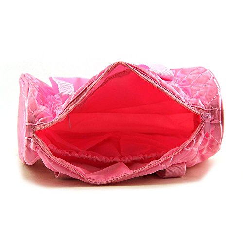 - Quilted diamond pattern satin duffel features an embroidered toe shoe design on front pocket