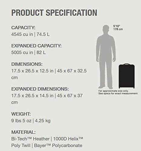 - COMPRESSION. Capacity of 77 liters. Expansion zipper increases main compartment by 15% so you can pack and reach your clothes with ease. Then simply close the zipper when you're ready to travel to compact your suitcase to original size.
