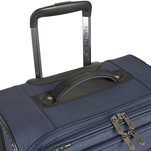 Details: Sail away with the Nautica Naval Yard 24 inch Suitcase. Equipped with a eight wheel spinner system, this luggage was made for easy and breezy travel. Durable polyester 8 wheel spinner system for easy maneuvering Push-button locking trolley handle Suitcase expands 2" for added packing capacity Top, side and bottom carry handles Multiple exterior pockets Fully lined interior with zippered pockets and adjustable valet straps 5 year warranty ID: 2590 Dimensions: 24" Expandable Spinner Suitcase - 24" x 16" x 10" - 8.00 lb