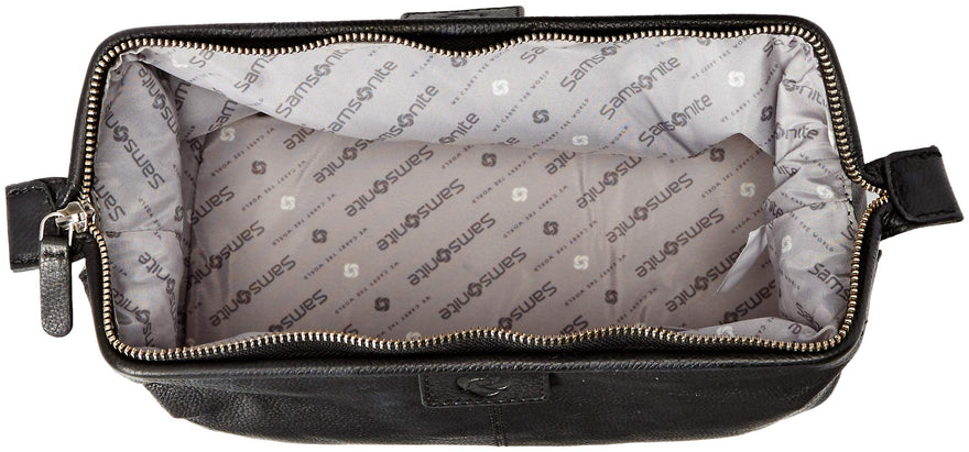 Details: Soft milled leather, Samsonite branded lining and raised Samsonite signature logo framed travel kit features a wide mount top zip main compartment, 2 interior slip pockets and a water resistant nylon bottom.