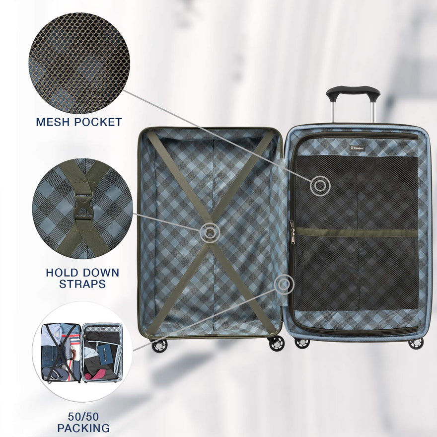 Details: Go big, stay light, and check it without worry! the Maxlite 5 29" expandable hardside spinner gives you maximum packing space in a large, ultra-durable checked bag conveniently designed with a 2" expansion option. Despite its lightweight construction, this bag is built tough with a flexible polycarbonate shell that protects contents while resisting cracking or splitting, a textured surface to help reduce visible scratching or scuff marks and molded corner guards that serve as built-in bumpers on high-wear points.Integrated lock allows TSA authorities to safely unlock and lock suitcase for inspection when needed (default lock code is 0-0-0 to open). Great for longer trips or multiple people, this bag's split case construction and interior divider panel provide separate packing compartments, and elastic hold-down straps keep everything in its place. Even at this size, mobility is easy on four 360 degree spinner wheels guided by the lightweight, height-adjustable PowerScope lite handle with comfortable Contour grip. Backed by Travelpro built for a lifetime limited warranty with our trusted companion promise which covers the cost of repair for damage from airline or other common carrier for 1 year.