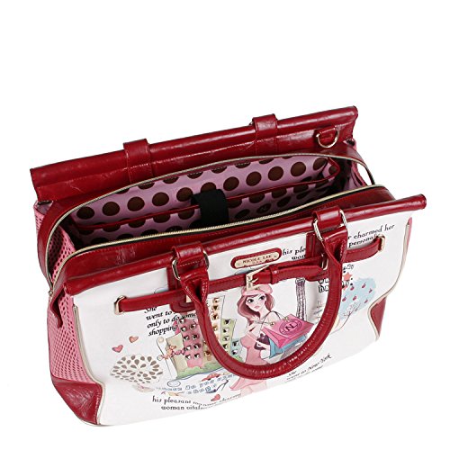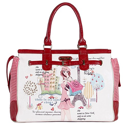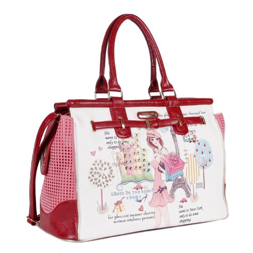 Details: Carry this season's must have the Nicole lee shopping girl print overnighter. Exterior features: made of faux leather, Nicole lee's shopping girl print on front and back, studs embellishments, circular laser cut design with no logo print on sides, front belt embellishment, gold-tone hardware, 2 top handles, 2 zipper closure, back zip pocket and Nicole lee nameplate in front. Interior features: zip wall pocket with no nameplate and double open wall pockets at interior back, laptop compartment with Velcro-strap and 7 open wall pockets at interior front, and polka dots print with no logo satin lining. Faux leather handles with 9 inch inch drop. Includes adjustable and detachable 30-54 inch inch shoulder strap. Color available is shopping girl. For cleaning, wipe with damp cloth.