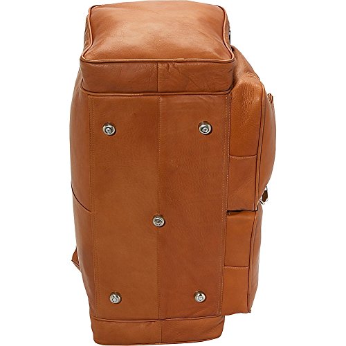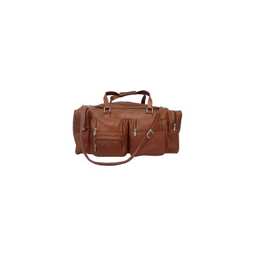 - Full-grain genuine leather duffel bag with zippered clamshell opening, thick piping trim, and multiple zippered compartments