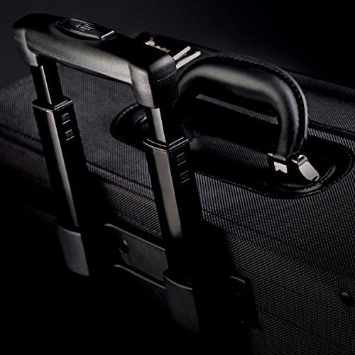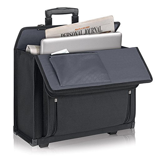Details: Interior compartment features a padded laptop pocket, accessory pouch, and divider panel with ample room for files. Protects most 17" laptops. Easily locate belongings with zip-down organizer that features a two-section accordion fan file. Telescoping handle system. Dual combination locks keeps belongings safe and secure.