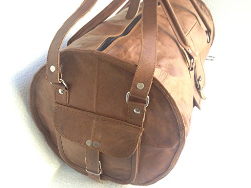 Details: Description: 100% genuine leather Duffel Gym / Sports / travel /cabin Bag with durable inner canvas lining and antique look accessories, Size 20'" Length x 10" height x 10" Width. Multi utility bag can be used as a travel, picnic, gym and sports bag etc. Big enough to carry weekend clothing and accessories. Genuine handmade product made from chemical and dye free leather. Veg tanning using natural edible oil and Sun tanning used for obtaining shades. Bag gives a wonderfully unique and antique look with use. A nice travel bag option and a perfect companion and gift for your close ones.