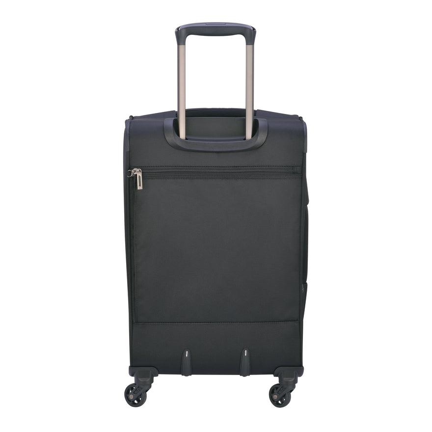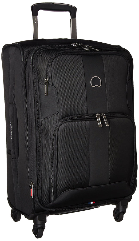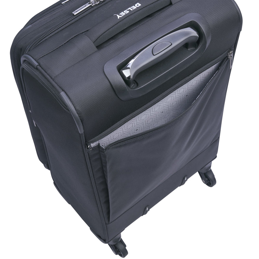 Details: This expandable spinner upright by DELSEY is part of the sky max collection, which has tons of organization, a light yet tough construction at a great value. 8 total pockets for exceptional storage: three front pockets for maximum organization, back pocket for magazines, mesh pocket and wet pocket in lid, shoe pockets in main compartment. Guardian self repairing interlocking zippers. Cushioned neoprene top and side carry handles. Easy to grab bottom handle. Integrated id tag. Interior tie-down straps. Expansion for maximum packing flexibility. Dual position trolley system for 2 or 4 wheel use.