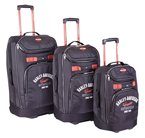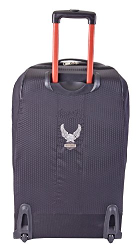 Details: Harley-Davidson 26" Tail Of The Dragon Pullman Wheeling Luggage, 99825 BLK. Constructed from strong water resistant polyester in patterned riptop. Features hidden telescoping pull handle, in-line skate wheels, dual zipper pulls on main section, front zippered pocket for accessories, top side/front handles, and interior pockets with tie straps. Fully lined interior, and contrasting riptop material on exterior. Ultra light weight design for easy travel. Size: 26" X 17" X 9.75"