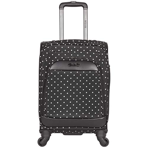 Details: Ultra-lightweight polka dot printed 600d polyester with leather-like vinyl trim and a fully lined interior. Tote fits most laptops with up to a 15.6" screen and is compatible with most tablets. Carry on expands for greater carrying capacity and features 4-wheel spinners. Carry on main compartment interior features garment restraints and a mesh zipper pocket with a large u-shaped mesh zipper pocket inside the lid. Luggage includes retractable top and side handles and molded bottom grab handle for easy lifting. Overall Dimensions- tote: 14"l x 5.5"W x 13.5"H - carry on: 14"l x 9-10.5"W x 22"h. Weight- tote: 1.9 lbs - carry on: 6.45 lbs. Includes a 10 year limited manufacturer's warranty.