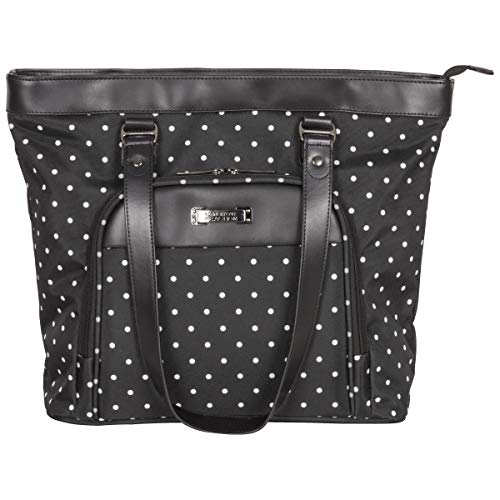- Ultra-lightweight polka dot printed 600D polyester with leather-like vinyl trim and a fully lined interior