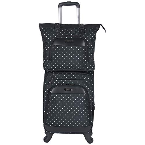 Details: Ultra-lightweight polka dot printed 600d polyester with leather-like vinyl trim and a fully lined interior. Tote fits most laptops with up to a 15.6" screen and is compatible with most tablets. Carry on expands for greater carrying capacity and features 4-wheel spinners. Carry on main compartment interior features garment restraints and a mesh zipper pocket with a large u-shaped mesh zipper pocket inside the lid. Luggage includes retractable top and side handles and molded bottom grab handle for easy lifting. Overall Dimensions- tote: 14"l x 5.5"W x 13.5"H - carry on: 14"l x 9-10.5"W x 22"h. Weight- tote: 1.9 lbs - carry on: 6.45 lbs. Includes a 10 year limited manufacturer's warranty.