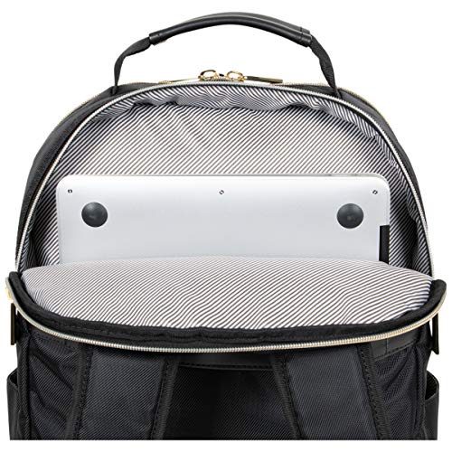 - Backpack features a separate rear padded laptop compartment that fits most laptops with up to a 15-inch screen. Spacious main compartment of bookbag features organization pockets and a padded tablet pocket. Front exterior compartment features an extensive business organizer and accessory pockets.
