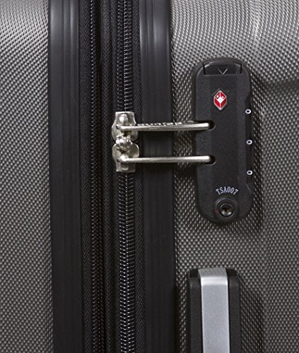 - Built-in TSA three-digit combination lock, spinner wheels, push-button telescopic handle, silver pewter hardware, soft gel padded top and side grip handles, protected corners