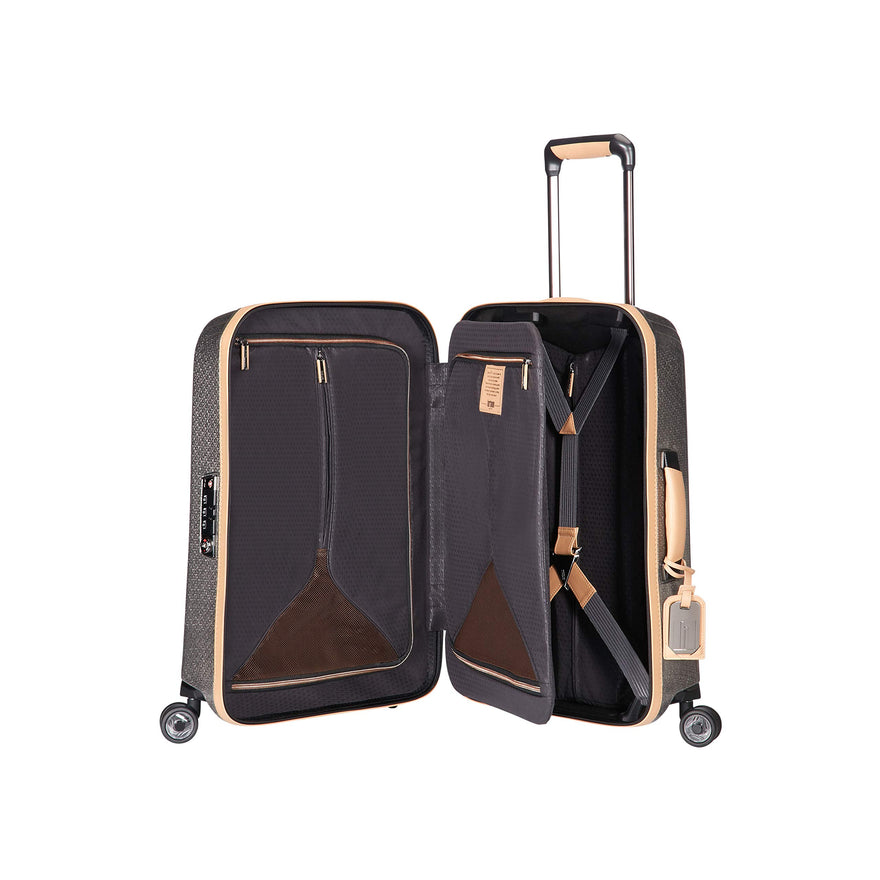 Details: Lightweight, scratch and impact-resistant, metalized Curv material Exceptionally resilient, dual tube aluminum pull handle with leather grip.Premium leather carry handles Smooth rolling double wheels with translucent polycarbonate core Recessed TSA lock Spacious packing compartments Mesh divided, zippered compartment Zippered accessory pocket Elastic cross strapsWeight: 5.1 lbs.Body Dimensions: 21.65" x 15.75" x 8.7"