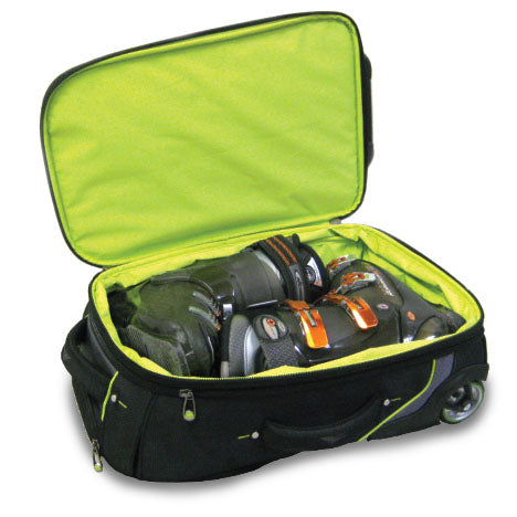 - Inline skate-style wheels, in protective corner-mounted housings with a unique integrated bridge that keep the bag rolling true