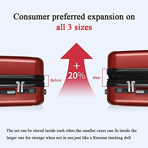 - 【3 PIECES SUITACSE SET】: 20"-boarding/carry-on case- 14 x 9 x 22 inch (7.1lbs), 24"-checked luggage- 18 x 11 x 27 inch (9.1lbs), 28"-checked luggage- 20 x 12 x 32 inch (11.6lbs), the smaller cases can fit inside the larger one for storage when not in use, just like a Russian stacking doll.