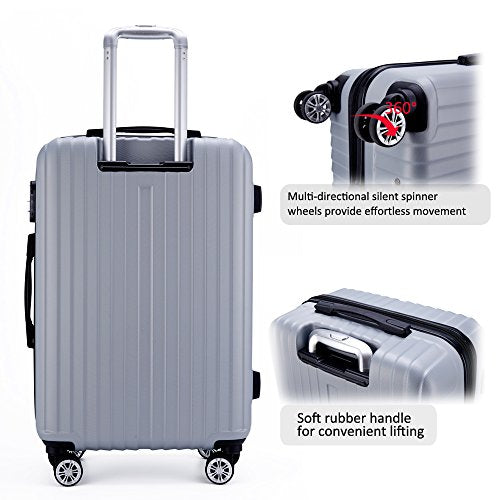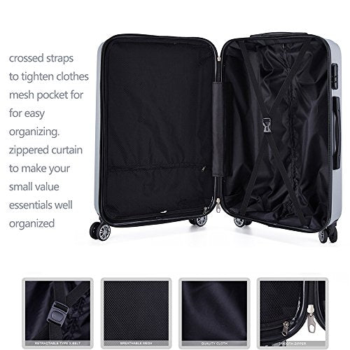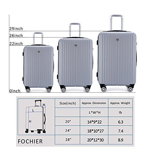 Details: Q&A Q:What is the weight and dimensions of each piece? A:Approx. Dimension: 20inch 22" x 14" x 9" , 24inch 27"x18" x 10",28inch 20"x12"x30" Approx. Weight: 20inch 6.3lbs ,24inch 7.4lbs ,28inch 8.5Ibs Q:Does this luggage expand? A:No, all 3 pieces are not expandable. Q:Can the lock be opened by TSA? A:No,all 3 piece are in combination lock. Q:Do I need to return all 3 piece if one case has a issue? A:No need,we will refund or send you a replacement of the broken one,contact our service team for help: b2c@fochier.com Q:How does the Warranty work? Like a handle comes off, or a wheel breaks, or else.. What do we do? A:Contact seller directly before returning,here is our email address: b2c@fochier.com . Please provide you order ID and attach the pictures of the broken item in the email.you will get the reply in 6 hours. Q:Is it 4 spinner wheels? A:Yes, 4 wheel spinners on all the luggage and the wheels rotate 360. Q:Will they fit inside each other for storage ? A:Yes, they can fit inside each other. Q:How do you change the lock combination from the default 000? A:There is an instructions picture above the detailed page. Q:Does each piece have side handle? A:The smallest one don't have side handle,other 2 piece have the side handle. Q:Does the carry on's size meet international flight regulations? A:Yes,the 20 inch suitcase (the smaller one) is suitable for carrying onto the plane. More questions,contact seller directly for a answer: b2c@fochier.com