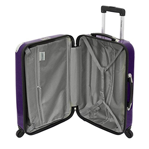 - Dual polycarbonate/abs shell, fully lined interior, compartment divider, tie-down straps, spinner wheels, push button telescopic handle, top and side carrying handle