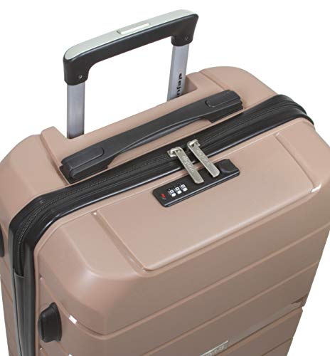 - Durable polypropylene construction with built in combination lock for added security, deluxe 8-wheel spinner system with telescopic handle for easy navigation