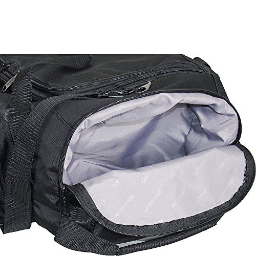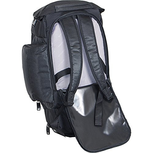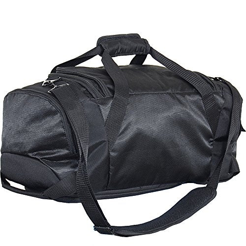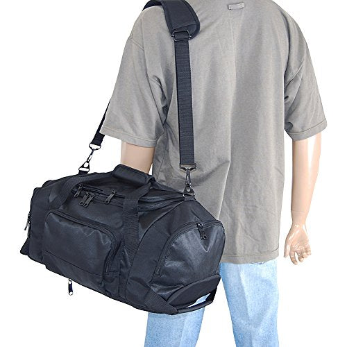 Details: 5215-BK Color: Black Pictured in Black Features: -Constructed of lightweight 1000-denier polyester with moisture resistance vinyl laminated. -Fully lined with 210-denier polyester, with padded bottom in interior. -Two way use, side shoulder strap, top grab handle and backpack. -Main compartment opening is specially design for easy packing need. -Two side compartment with a nylon coil zipper closure with easy storage. -Front zipper pocket with two opening pocket and pen holder. -Clear mesh pocket under the top pocket. -Two top zipper pocket, separated fleece lining compartments for glass and other items. -Four-point center-grab handles are stitch reinforced and padded handle wrap. -Rear convert to backpack for easy carry. -Two side webbing tight down straps. -Dimensions: 10'' H x 19'' W x 10'' D.