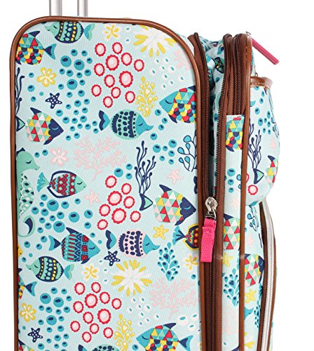 Details: Lily Bloom brings bright, bold fashions to your travel accessories. This spinner luggage features a signature fabric made ofrecycled water bottles, coastal fish design, 4 wheel spinner system, push-button locking mechanism, telescoping trolley handle, three exterior zipper pockets, top and side handles, fully lined interior, and valet straps. This beautifully vibrant luggage is perfect for the environmentally conscious traveler. Measures 29.5''L x 18.2''W x 12.8''H. Weighs 10.1 lbs.