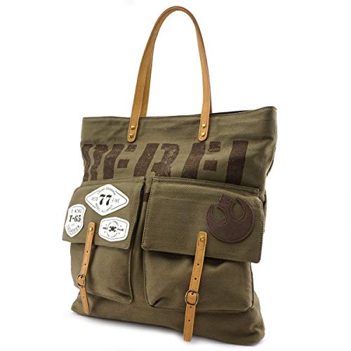 Details: Smuggle plans for rebel missions in this sturdy Star Wars canvas tote bag by Loungefly. Featuring X-wing squadron patches and the Alliance Starbird symbol, everyone will know which side you represent. Sturdy canvas design with faux leather handles and straps Dimensional metal Star Wars /Loungefly label on front Distressed screen art Felt X-wing squadron patches Faux leather Alliance Starbird symbol Two large flap pockets with decorative faux leather straps with buckle Flap pockets feature snap closure Main compartment features snap closure Interior zip pocket Interior slip pocket Canvas lining with allover X-wing squadron print