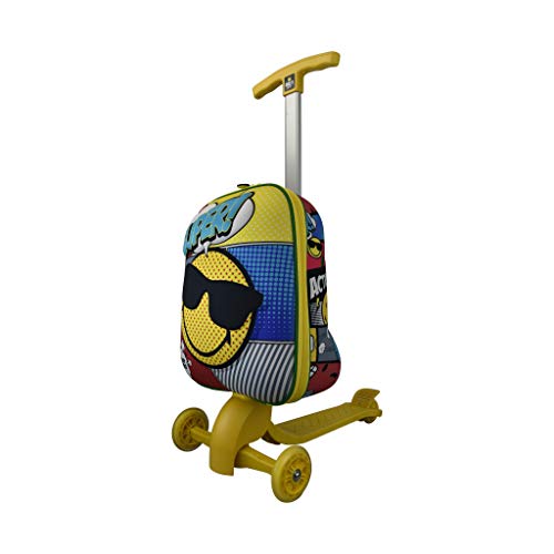 Details: This awesome Super Cool Smiley scootie is made with a 3D design that pops and attracts compliments anywhere you go. Putting a scooter and luggage together, our improved version of our old scootie model is better than ever. Making travel fun for the whole family! Ages 3-9 Total Weight 9.2 lbs. Size: 24" x 12" x 11"